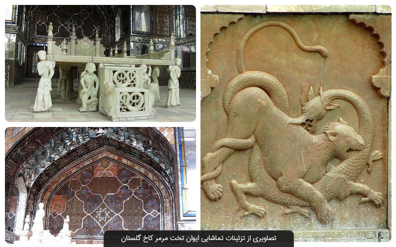 The gilded decorations on stone surfaces such as the Shams-ol-Amara and the Marble Throne add to the charm of the palace, reflecting a style popular during the Qajar era. Skilled goldsmiths of the time used metal sheets in these decorations and displayed their skills. The use of gold in the architectural decorations of Golestan Palace, along with the emphasis on durability, increases the value of this complex. In the following, we will further introduce the different parts of Golestan Palace.